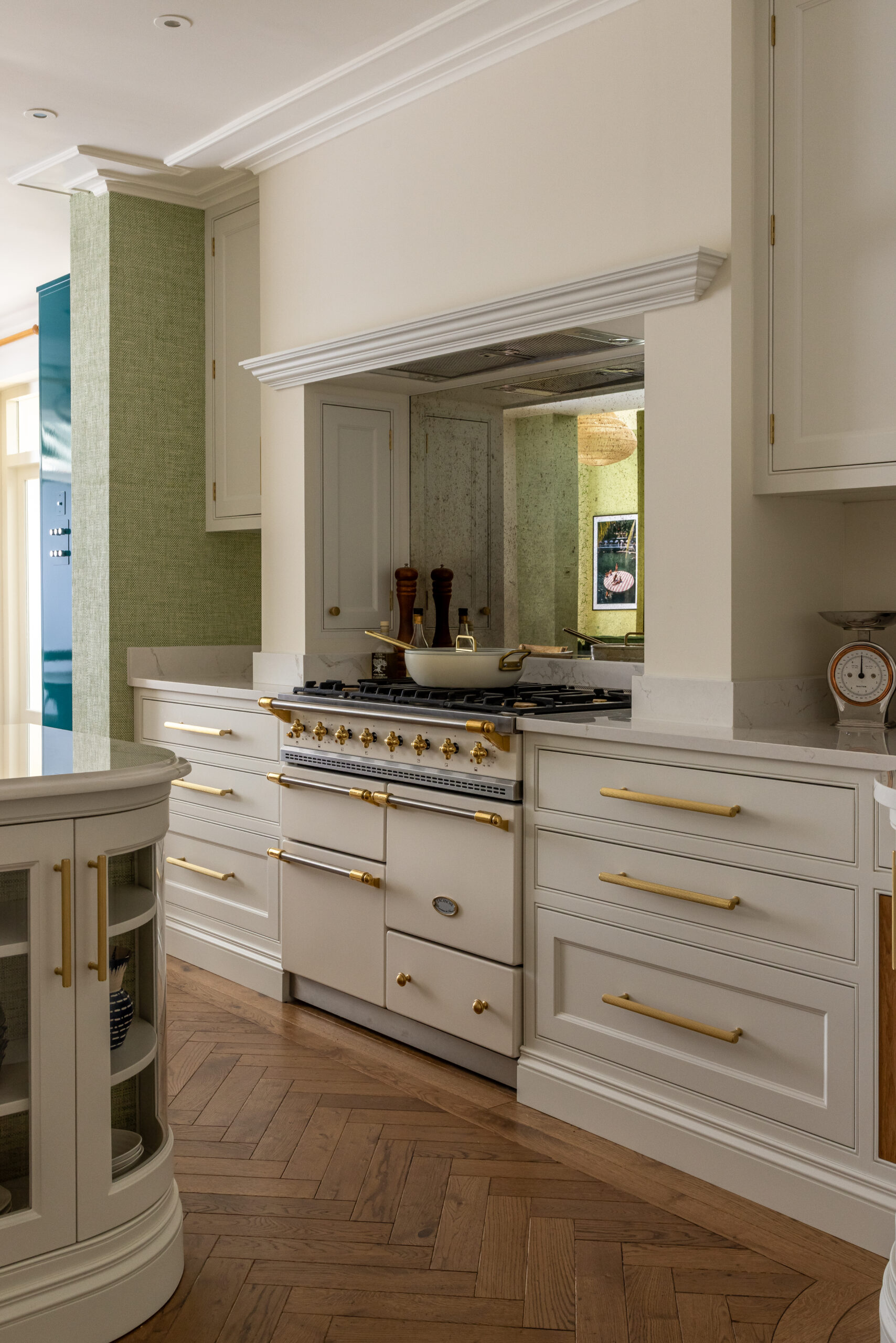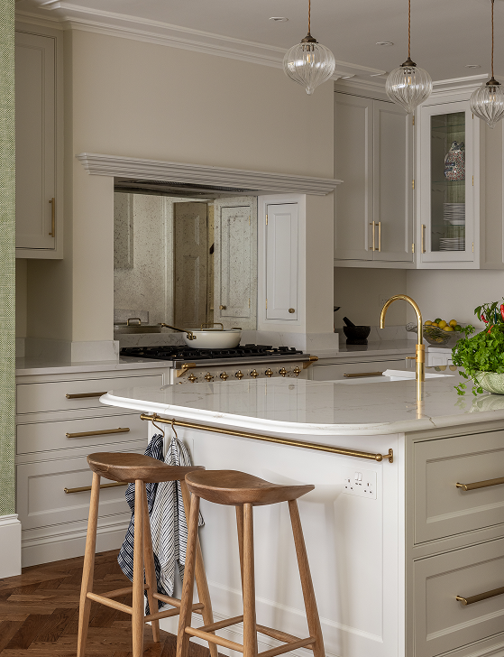 At its core, this kitchen is designed for living — a fully functioning culinary space that fuses craftsmanship with innovation. Every inch of it tells a story of meticulous attention to detail. From bespoke, push-to-release chopping boards and trays, to a hidden door that unveils the pantry, the design is brimming with thoughtful touches. The subtle texture of Phillip Jeffries’ grass cloth applied to the back of the wall-hung units adds a gentle richness — an understated nod to refined elegance, and importantly home comfort.